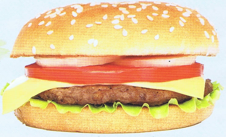 100 g Rindfleisch mit Salat, Cheddar Cheese, Tomaten, Essiggurken, scharfe Pfefferoni, American Sauce |