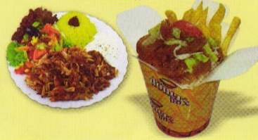 mit Reis, Salat, Kartoffelsalat. Zwiebel und Sauce