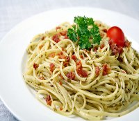 Speck, Champignons, Knoblauch in Tomatensauce |
